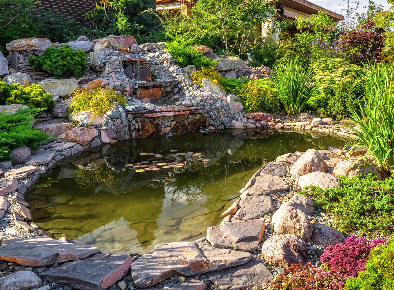 Water features—such as ponds, waterfalls, and fountains—bring soothing movement and sound to your landscape, helping create a peaceful, relaxing environment. We also design pergolas and outdoor structures that provide shade, structure, and functionality while blending seamlessly with your overall design.